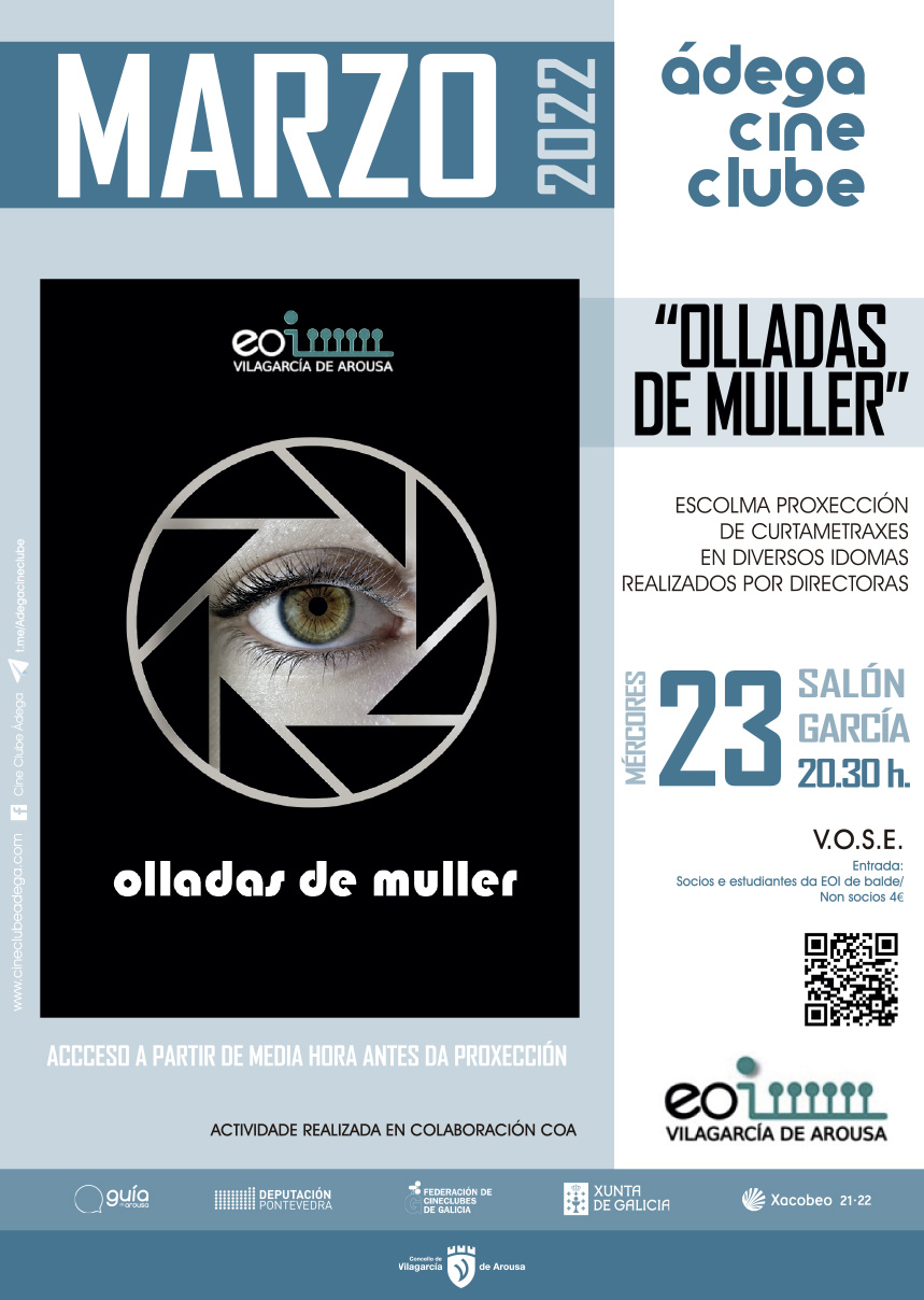 Para conmemorar o mes da muller, o Cine Clube Ádega organiza conxuntamente coa EOI de Vilagarcía e co CIM do Concello de Vilagarcía unha proxeción de cine o mércores 23 de marzo de 2022, baixo o lema OLLADAS DE MULLER.