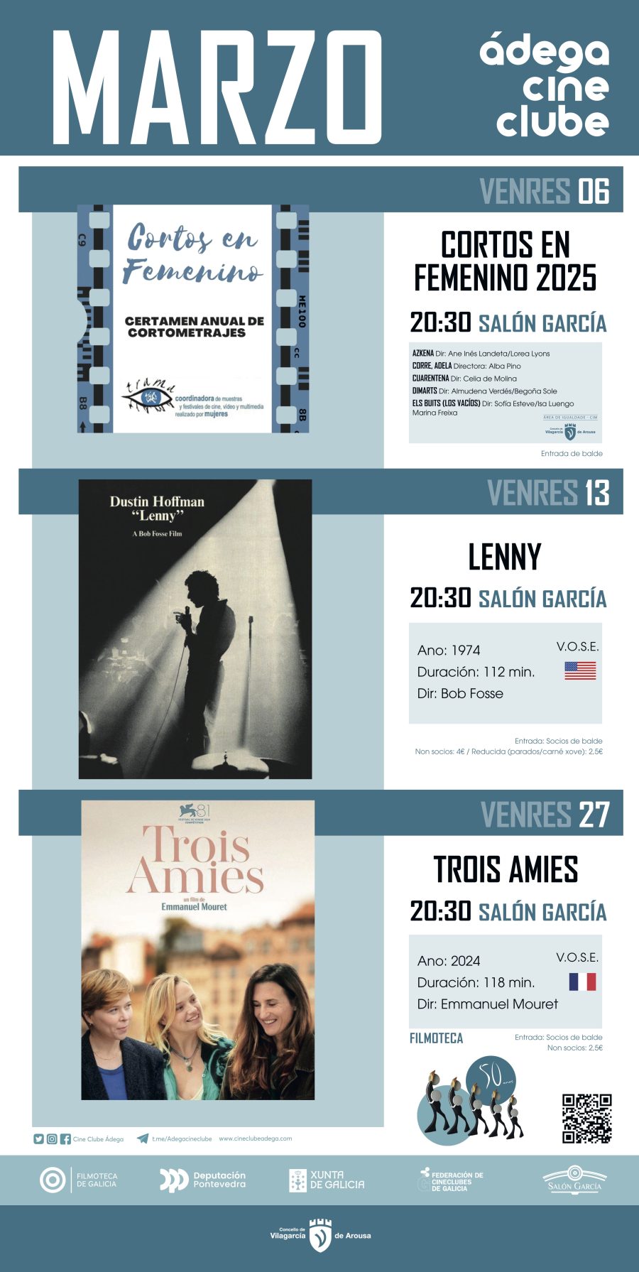 Remataremos o mes o venres 27 co comezo dunha nova etapa colaborativa coa Filmoteca de Galicia. E para comezar a primavera cun sorriso proxectaremos a comedia francesa de 2024 “Tres amigas”, dirixida por Emmanuel Mouret.